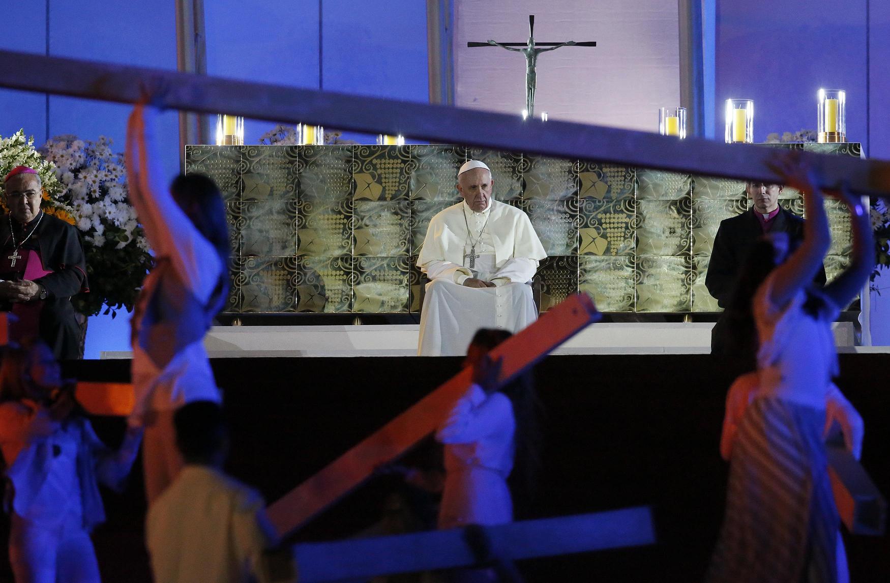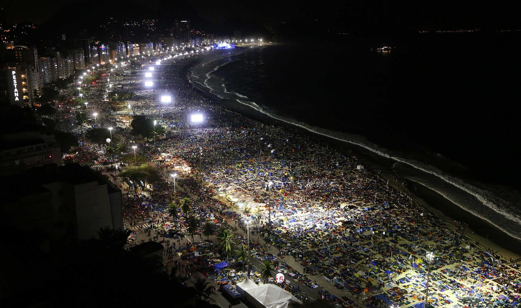 Više od dva milijuna mladih okupilo se 27. srpnja navečer s papom Franjom na molitvenom bdjenju na Copacabani, gdje će mladi provesti i noć u iščekivanju završne Mise 28. Svjetskog dana mladih. Vožnju Pape kroz Atlantsku aveniju do plaže Copacabana mladi su pratili povicima „Esta es la juventud del Papa” (Ovo je Papina mladež). U središtvu prvog dijela dvosatnog programa bila je scenografija u kojoj su mladi po primjeru sv. Franje uprizorili gradnju jedne crkve, a sve to isprepleteno svjedočanstvima četvero mladih. Tridesetogodišnji mladić iz sređene i vjerničke obitelji prošao je kroz svijet razočaranja, droge i magije, uz abortus vlastitog djeteta da bi se potom vratio Bogu i sada sudjelovao u pripremi Svjetskog susreta mladih; svećenik je pošao u misijske zemlje da bude navjestitelj Radosne vijesti; 23-godišnji mladić kao žrtva razbojničke pljačke u svom domu, s plamenom vjere upaljenim na susretu u Madridu 2011., svoja je invalidska kolica prihvatio kao križ radosti i prisutne mlade pozvao na vjernost; 21-godišnja djevojka nesretna zbog majke koja boluje od anoreksije, psuje i kćer doživljava kao teret, slušajući na radiju jednu duhovnu pjesmu doživjela je radost ljubiti Boga i bližnje, uz duboku želju pomoći majci.